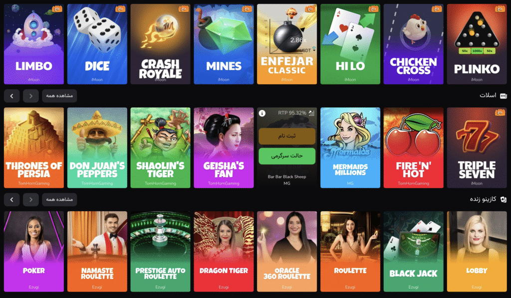 بلک جک، باکارات، سیک بو، انواع بازی رولت، انواع بازی پوکر و ویدیو پوکر با دیلر زنده در دسترس کاربران است.
