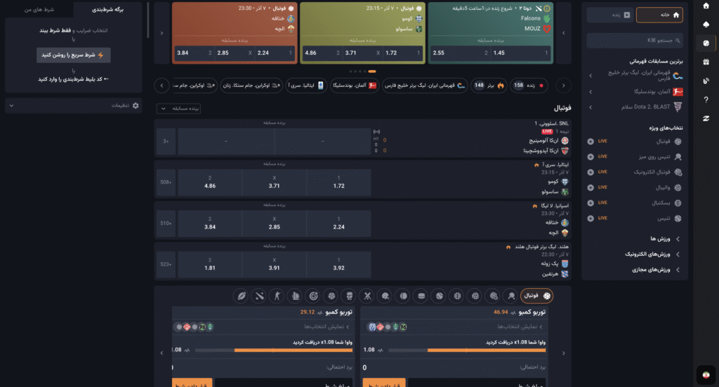 در کنار بخش پیش بینی ورزشی، اگر از منوی سمت راست روی گزینه زنده بزنید، رویدادهای ورزشی در حال برگزاری را می‌توانید ببینید و پیش بینی خود را روی آن به ثبت برسانید.